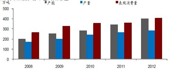 2012年,我国合成橡胶产量284万吨,表观消费量404万吨,进口量为144万吨,2012年,我国合成橡胶进口量占表观消费量的35.57%。