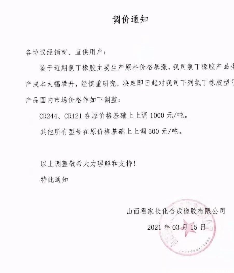 调价函:氯丁橡胶、丁基橡胶上涨!