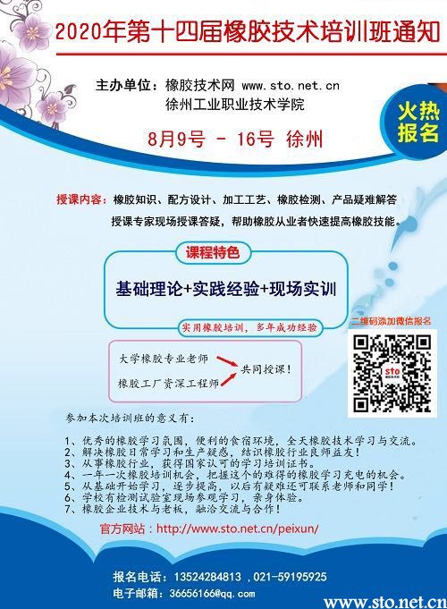 橡胶技术网携手徐州工业职业技术学院定于2020年8月9日-16日在徐州举办橡胶技术培训班。