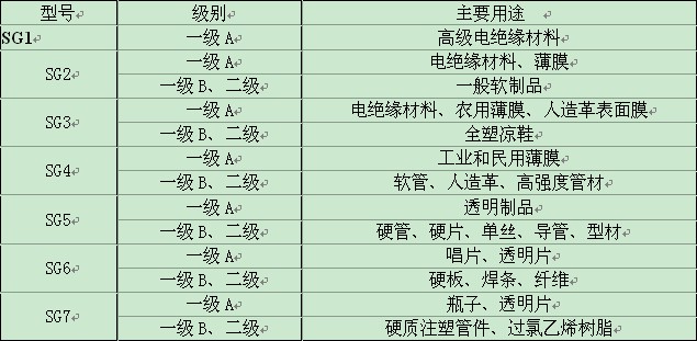 工业上常用粘度或K值表示平均分子量(或平均聚合度)。树脂的分子量和制品的物理机械性能有关。分子量越高,制品的拉伸强度、冲击强度、弹性模量越高,但树脂熔体的流动性与可塑性下降。同时,合成工艺不同,导致了树脂的形态也有差异,我们常见的是悬浮法生产的疏松型树脂,俗称SG树脂,其组织疏松,表面形状不规则,断面输送多孔呈网状。因此,SG型树脂吸收增塑剂快,塑化速度快。悬浮法树脂的主要用途见下表。乳液法树脂宜作PVC糊,生产人造革。
