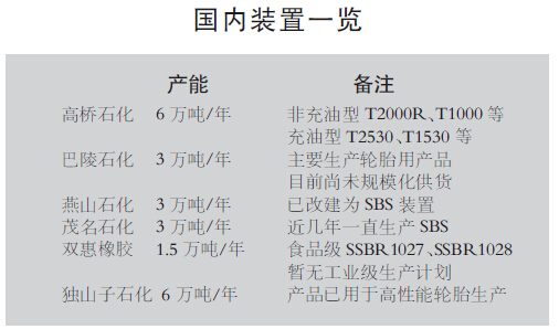 根据国际合成橡胶生产者协会(IISRP)统计,2013年底全球SSBR的总生产能力已达到144.9万吨,SSBR的生产商主要集中在美国、日本、德国和法国等发达国家,占整个SBR的36.5%~50%。随着对轮胎环保、节能、安全的要求越来越高,未来几年,世界SSBR的年均需求量将以超过10%的速度增长,到2015年,SSBR的总需求量预计将超过200万吨,开发利用前景广阔。
